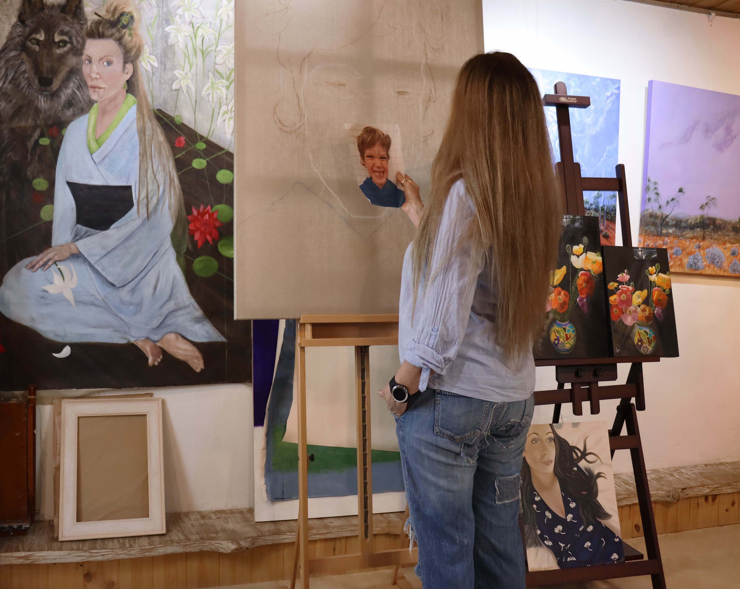 In the studio sketching a large format portrait onto a stretched linen surface which will become a lovely oil painting.