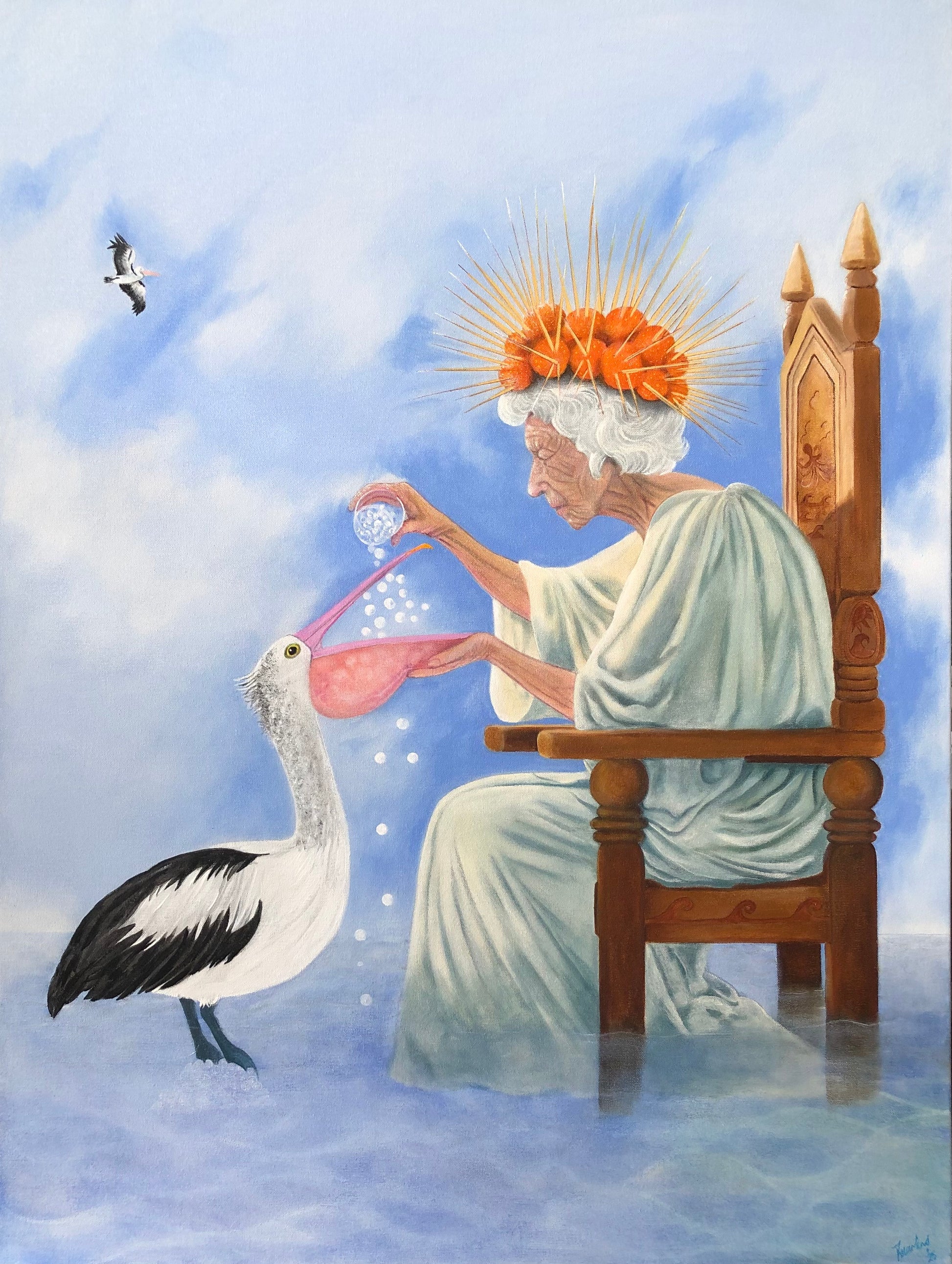 Acrylic on canvas. Brushwork. Varnished. Representational magical realism.