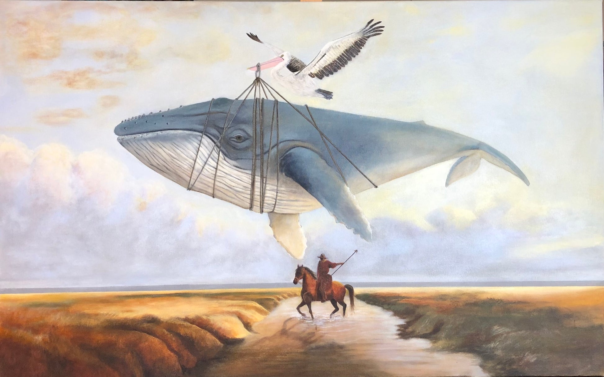 Carried not by the sea, but by a lone pelican, wings strained, sky heavy. Below, a cowboy on horseback takes aim, harpoon raised, eyes fixed.